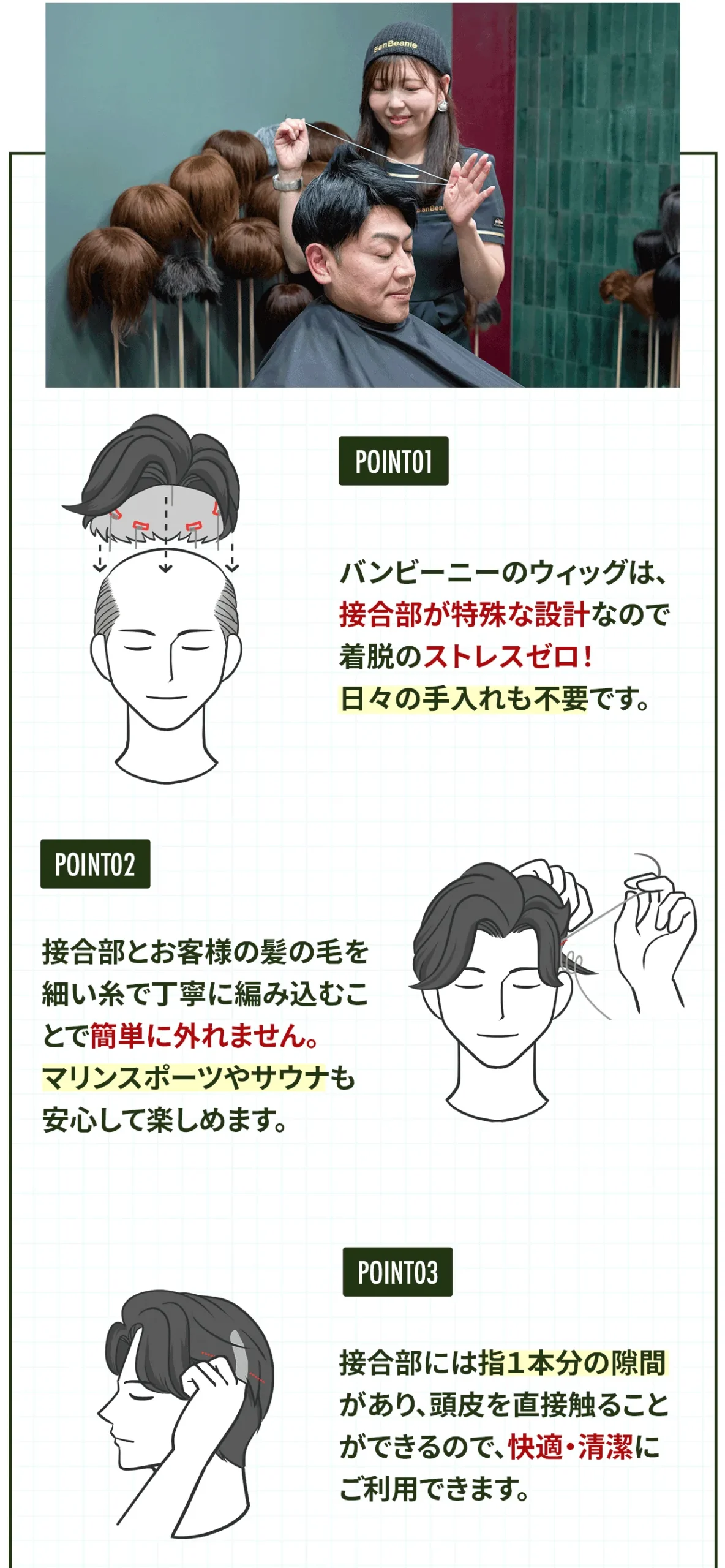 ウィッグは “買った瞬間が一番自然”――そんな常識を変えたのが、バンビーニーのサブスク制スタイルです。“整え続けるウィッグ”として、忙しい大人の男性が自然に、長く、安心して使い続けられる仕組みをご提案します。